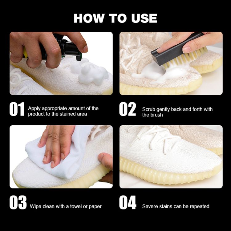Shake the foam bottle well and apply a generous amount to a soft brush or cloth. Gently scrub the shoes in circular motions, then wipe off excess foam with a damp cloth.